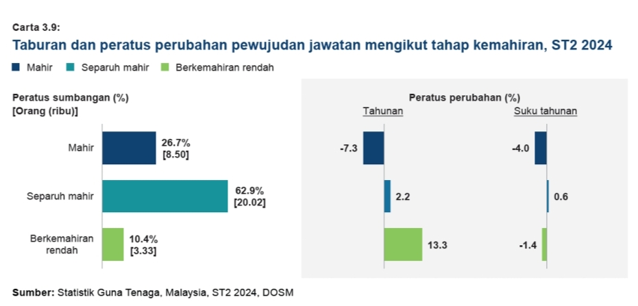 16. Tambahan lagi, pewujudan jawatan tahap mahir telah merekodkan penurunan tahunan sebanyak 7.3%, sebaliknya tahap separuh mahir telah meningkat 2.2% dan berkemahiran rendah meningkat 13.3%.