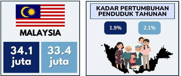 1. Baru-baru ini, Jabatan Perangkaan Malaysia (DOSM) telah menerbitkan Laporan Anggaran Penduduk Malaysia 2024. Menurut laporan berkenaan, penduduk Malaysia kini berjumlah 34.1 juta orang. Jumlah penduduk negara telah meningkat 1.9% dari 33.4 juta orang (2023).