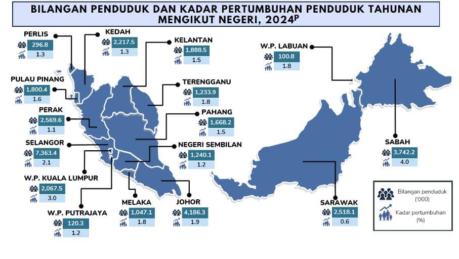- Sabah merekodkan pertumbuhan penduduk tertinggi, iaitu 4.0%