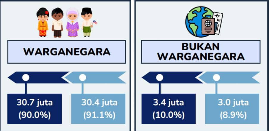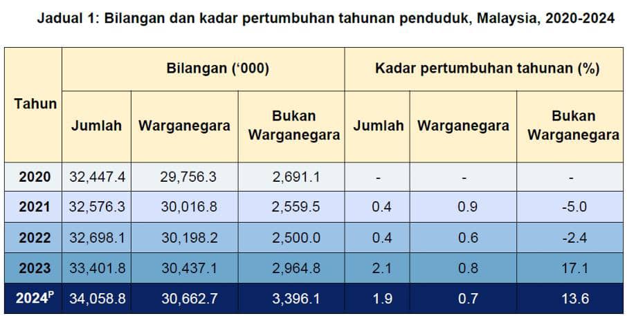 4. Kadar pertumbuhan mendadak tersebut telah menyaksikan jumlah penduduk bukan warganegara meningkat seramai 0.4 juta orang, dari 3.0 juta (2023) kepada 3.4 juta (2024). Sementara peratusan pula telah meningkat dari 8.9% (2023) kepada 10% (2024).