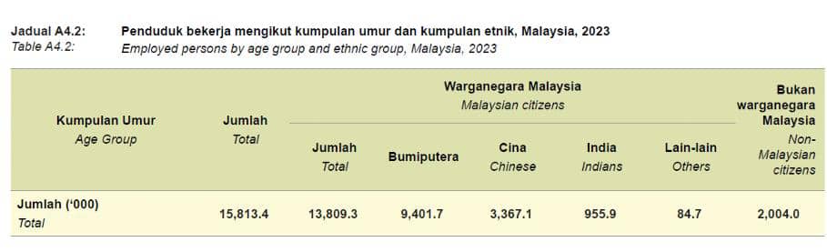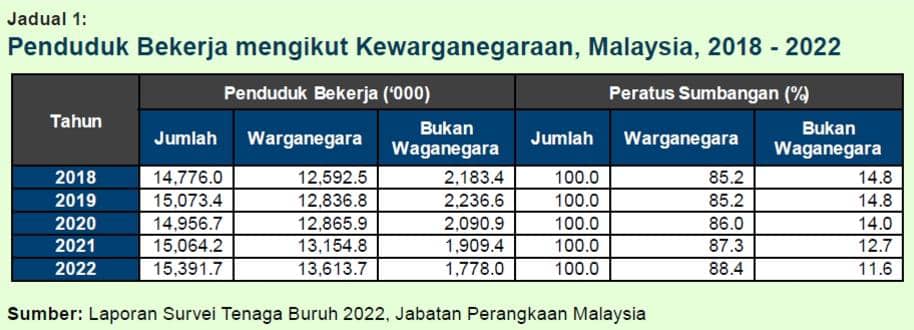 7. Menurut Laporan Survei Tenaga Buruh 2023, peratusan penduduk bekerja bukan warganegara telah meningkat kepada 12.7% (2.004 juta orang) daripada jumlah keseluruhan penduduk bekerja negara (15.8134 juta orang).