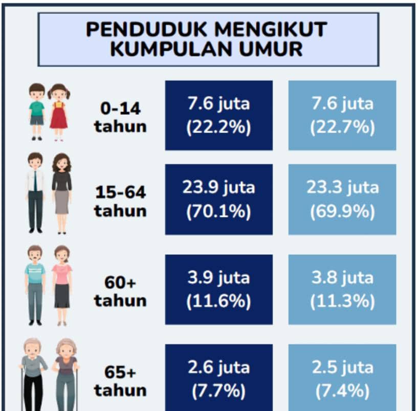 12. Pada tahun 2024, peratusan golongan 60 tahun ke atas telah meningkat sedikit kepada 11.6% dari 11.3% (2023), manakala golongan muda (0 – 14 tahun) pula telah menurun kepada 22.2% dari 22.7% (2023).