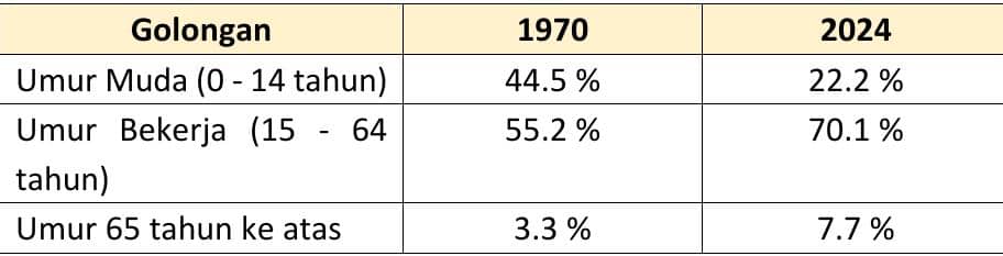 13. Malah, menurut data DOSM, dalam tempoh masa 54 tahun (1970 – 2024), peratusan golongan 65 tahun ke atas telah meningkat lebih 200%, sementara peratusan golongan umur muda (0 – 14 tahun) telah menurun 50%.