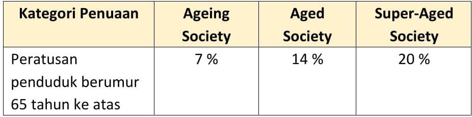 15. United Nations (UN) telah menetapkan 3 kategori penuaan, bersandarkan peratusan penduduk berumur 65 tahun ke atas: