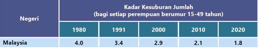 Dalam bahasa mudah, pada tahun 2020, secara purata seorang wanita hanya melahirkan 1.8 orang anak, berbanding 4.0 orang anak pada tahun 1980.