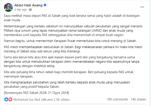 Hadi Awang berkata PAS mahu menang di Sabah dalam ucapan perasmian Konvensyen PAS Di Kota Kinabalu pada 31 Ogos 2024