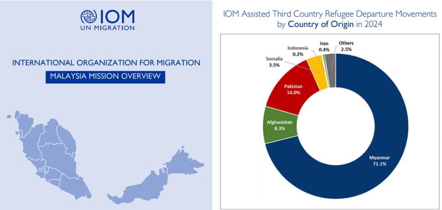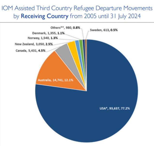 The International Organization for Migration (IOM) yang berpusat di Malaysia sejak 1980 telah banyak membantu imigran dan pelarian asing ini untuk mobilisasi ke tempat baharu, kebanyakkan ke negara Amerika Syarikat (77.2%), Australia (12.1%), Kanada (4.5%) dan negara-negara lain.