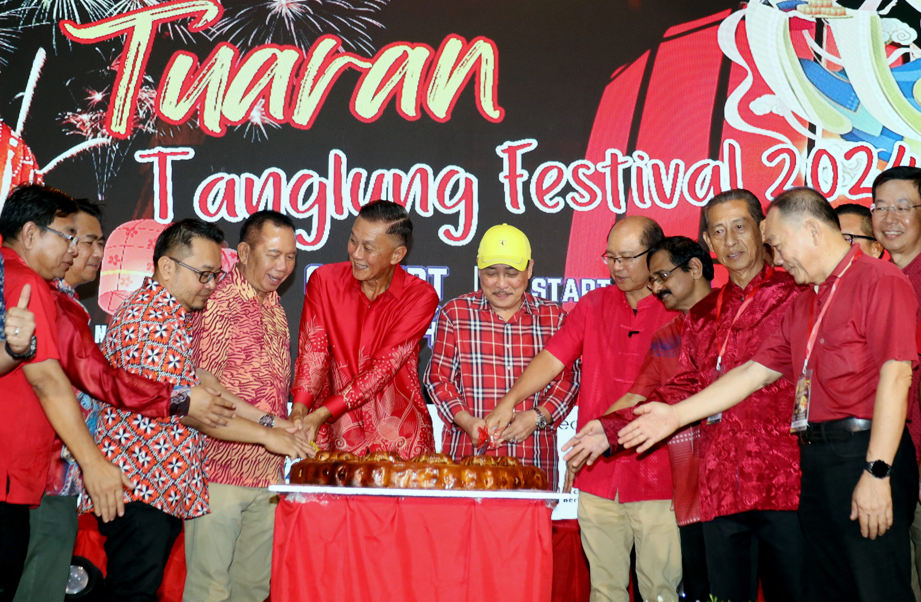 Ketua Menteri, Datuk Seri Panglima Haji Hajiji Haji Noor diiringi Presiden Lions Club Tuaran, Kapitan Frankie Goh (lima kiri) menyempurnakan gimik perasmian dengan memotong kuih bulan (Moon Cake) sempena Pesta Tanglung Tuaran 2024 di Padang Astaka Tuaran pada Sabtu.