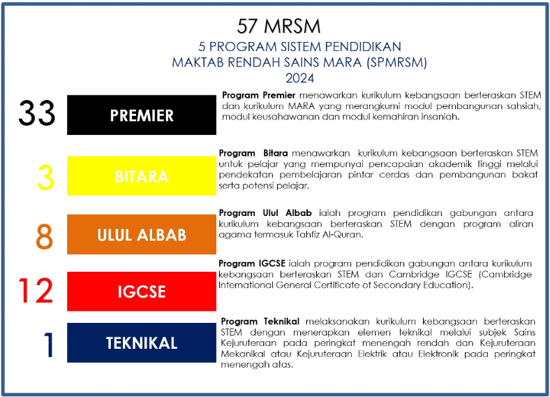 8.        Fakta menarik: Maktab Rendah Sains MARA (MRSM) adalah institusi pendidikan peringkat menengah di bawah pengurusan Majlis Amanah MARA (MARA). Misi utama MRSM ialah untuk melahirkan pelajar yang berpotensi tinggi dalam bidang Sains, Teknologi, Kejuruteraan dan Matematik (STEM).