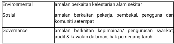 Environmental amalan berkaitan kelestarian alam sekitar Sosial amalan berkaitan pekerja, pembekal, pengguna dan komuniti setempat Governance amalan berkaitan kepimpinan/ pengurusan syarikat, audit & kawalan dalaman, hak pemegang taruh