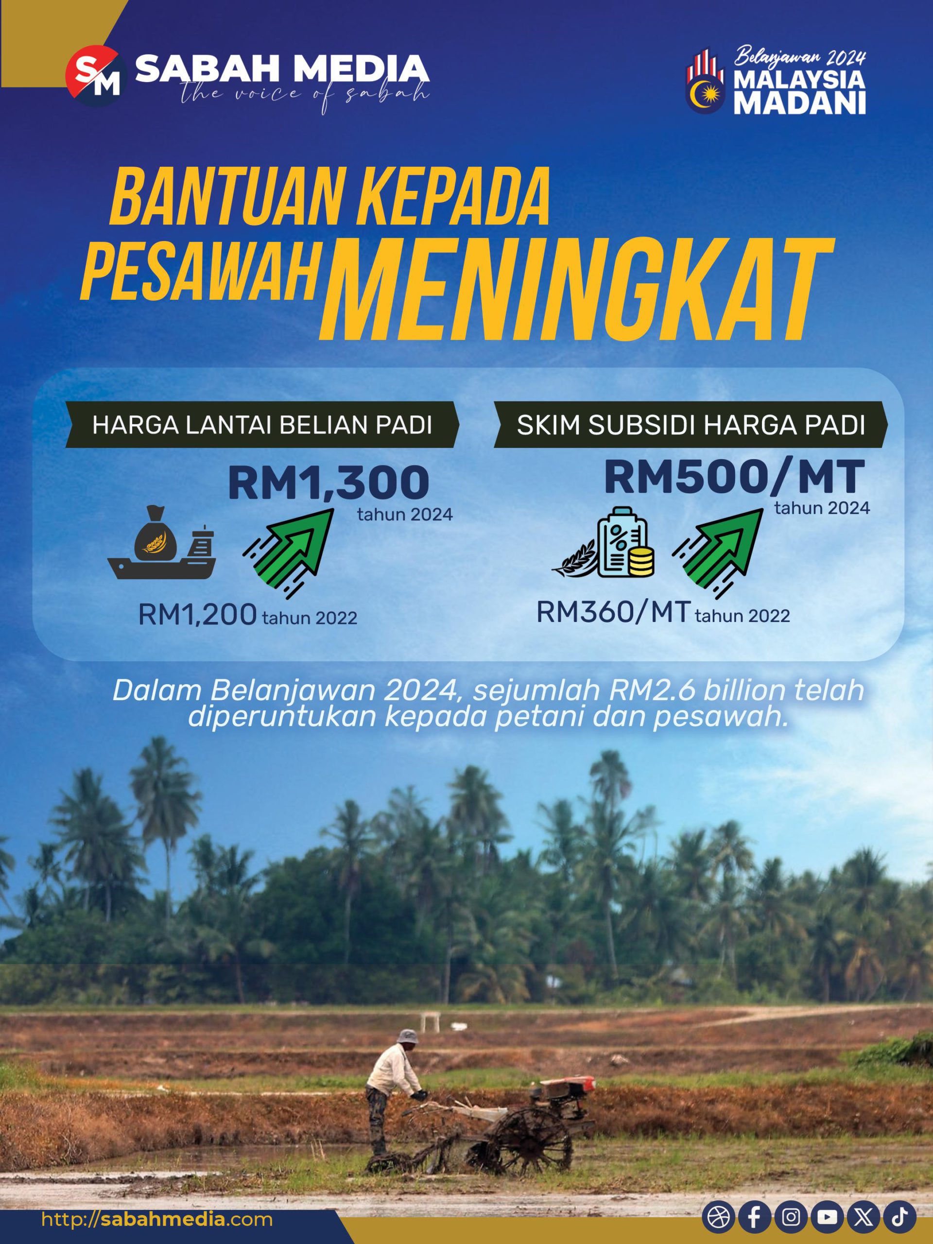 Dalam Belanjawan 2024 yang lepas, sejumlah RM2.6 billion telah diperuntukan kepada petani dan pesawah. Buat pertama kalinya juga Skim Subsidi Harga Padi dinaikkan daripada RM360 kepada RM500 per metrik tan. Malahan harga lantai belian padi daripada RM1,200 kepada RM1,300 per metrik tan dinaikkan bagi meningkatkan pendapatan petani.