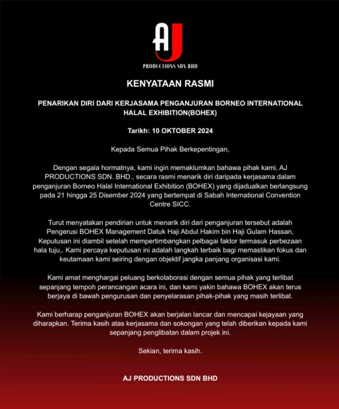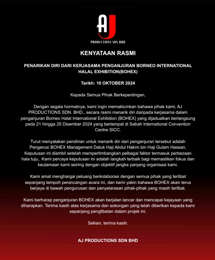 “Kepada Semua Pihak Berkepentingan, dengan segala hormatnya, kami ingin memaklumkan bahawa pihak kami, AJ PRODUCTIONS SDN. BHD., secara rasmi menarik diri daripada kerjasama dalam penganjuran Borneo Halal International Exhibition (BOHEX) yang dijadualkan berlangsung pada 21 hingga 25 Disember 2024 yang bertempat di Sabah International Convention Centre (SICC).