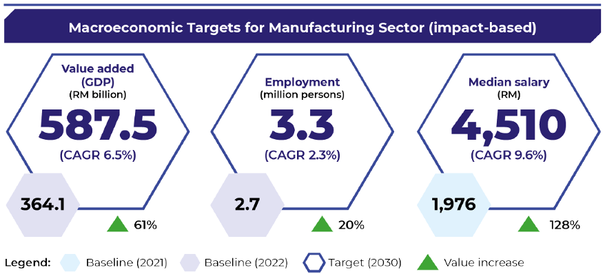 Kerajaan Malaysia telah menetapkan sasaran besar bagi tempoh tujuh tahun pelaksanaan NIMP 2030 untuk memperkukuh ekonomi negara. Sasaran ini termasuk peningkatan 61% nilai tambah Keluaran Dalam Negeri Kasar (KDNK) kepada RM587.5 bilion, penciptaan 3.3 juta pekerjaan (peningkatan 20%), dan peningkatan 128% dalam median upah pekerja kepada RM4,510.