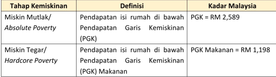 9. Kedua-dua kadar berkenaan di gunakan untuk mengenal-pasti dua tahap kemiskinan negara, iaitu: Miskin Tegar dan Miskin Mutlak.