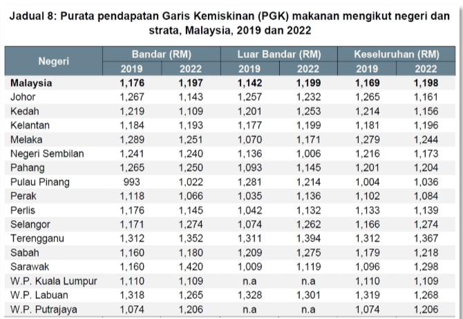 14. Di samping itu, agak pelik negeri dan wilayah yang lebih membangun dan maju memiliki PGK Makanan yang lebih rendah berbanding negeri dan wilayah yang lain, seperti: Pulau Pinang (RM 1,036), WP Kuala Lumpur (RM 1,109) dan Johor (RM 1,161).