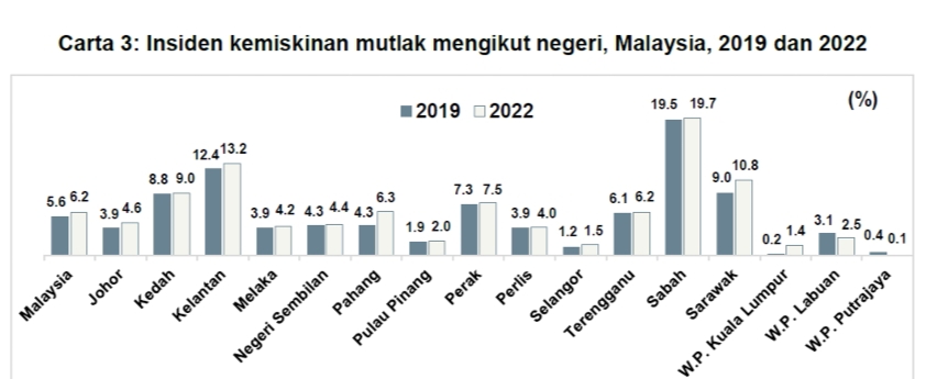 22. Sebaliknya, data menunjukkan insiden kemiskinan mutlak di majoriti negeri dan wilayah telah meningkat.