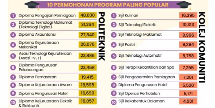Antara perkara yang menarik ialah jurusan pengajian yang di pilih oleh calon pelajar. Menurut laporan BERNAMA, jurusan pengajian yang paling popular dimohon oleh calon untuk kemasukan ke Politeknik dan Kolej Komuniti Sesi 2024/ 2025 adalah: