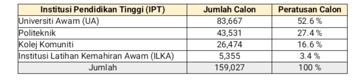 Majoriti pelajar (83,667 orang: 52.6%) di beri tawaran kemasukan ke Universiti Awam. Manakala selebihnya pula telah diberi tawaran kemasukan ke Politeknik, Kolej Komuniti dan Institusi Latihan Kemahiran Awam (ILKA).
