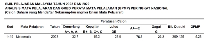 Malah, untuk SPM Matematik 2023, majoriti pelajar (52.1%) telah tidak berjaya mencapai gred kepujian ke atas, dan hanya memperolehi gred D, E dan Gagal.