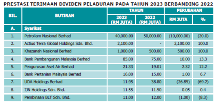 Menurut Laporan Ketua Audit Negara 3/2024, jumlah dividen yang diterima oleh kerajaan daripada 18 syarikat dan 2 badan berkanun pada tahun 2023 menurun sebanyak RM 9.756 bilion berbanding tahun 2022. Sebagai contoh, PETRONAS mencatatkan penurunan dividen terbesar daripada RM 50 bilion kepada RM 40 bilion, diikuti Bank Negara Malaysia yang mencatatkan penurunan sebanyak RM 2.25 bilion.