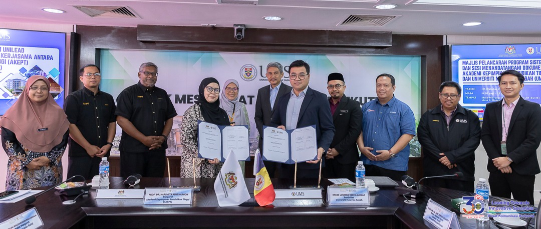 Kota Kinabalu :  Akademi Kepimpinan Pendidikan Tinggi (AKEPT) dan Universiti Malaysia Sabah (UMS) telah menandatangani kerjasama bagi projek penambahbaikan sistem ‘University Leadership Directory’ (UniLead), baru-baru ini.