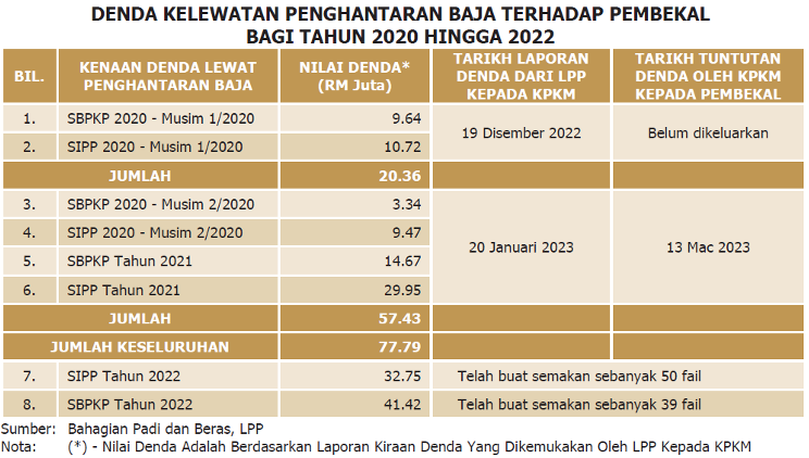 Namun begitu, LKAN 2022 melaporkan bahawa, pada tahun 2021, Kementerian Pertanian dan Industri Makanan (KPKM) telah memutuskan untuk mengecualikan sepenuhnya denda yang di kenakan kepada pembekal baja untuk tempoh masa 2016 – 2019 berjumlah RM 211.27 juta: RM 195.44 juta (2016 – 2018) dan RM 15.84 juta (2019).