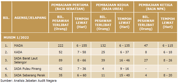 Selain itu, Laporan Ketua Audit Negara 2022 (LKAN 2022), yang di terbitkan pada November 2023, telah melaporkan isu kelewatan pengedaran baja kepada petani padi. Menurut LKAN 2022, kelewatan pengagihan baja kepada petani melibatkan tempoh masa sehingga 135 hari.