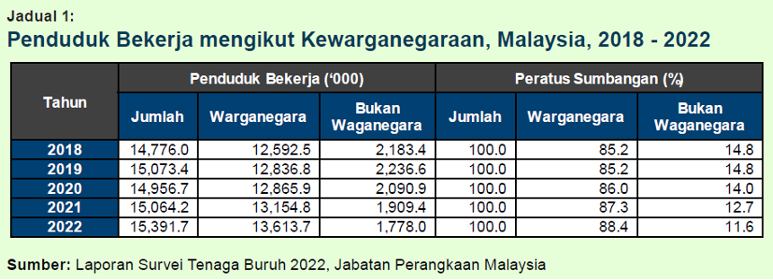 Data Jabatan Perangkaan Malaysia (DOSM) pula menunjukkan jumlah pekerja asing kembali meningkat setelah menurun dengan ketara sepanjang pandemik Covid-19 (2020 – 2022).
