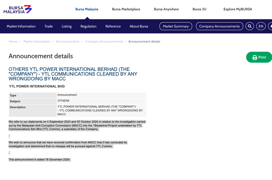 Merujuk pemakluman Bursa, Syarikat itu memaklumkan bahawa mereka telah menerima pengesahan daripada SPRM bahawa siasatan telah selesai dan tiada pertuduhan akan dikenakan terhadap YTL Comms.