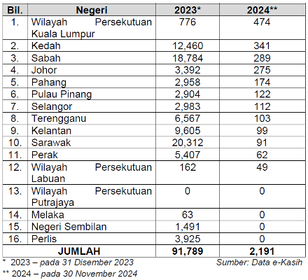 Berdasarkan data e-Kasih, dalam tempoh masa 1 tahun, jumlah keseluruhan insiden Miskin Tegar negara telah menurun dengan mendadak 98%, dari 91,789 (2023) kepada 2,191 (2024). Ini merupakan satu kejayaan luar biasa dalam tempoh masa yang singkat.