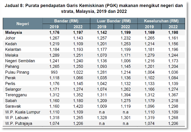 Sebagai contoh. Kadar PGK Makanan tertinggi adalah di Terengganu (RM 1,367), dan terendah di Pulau Pinang (RM 1,036). Manakala, kadar PGK Makanan nasional (RM 1,198).