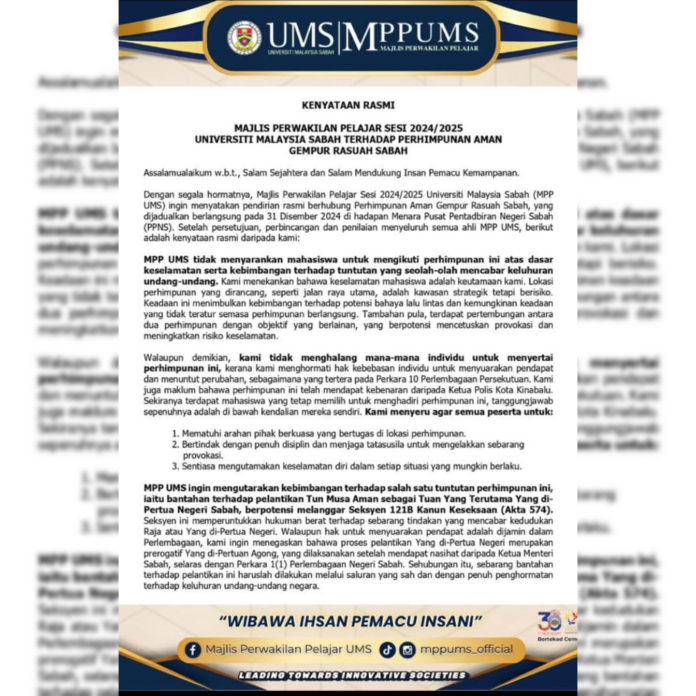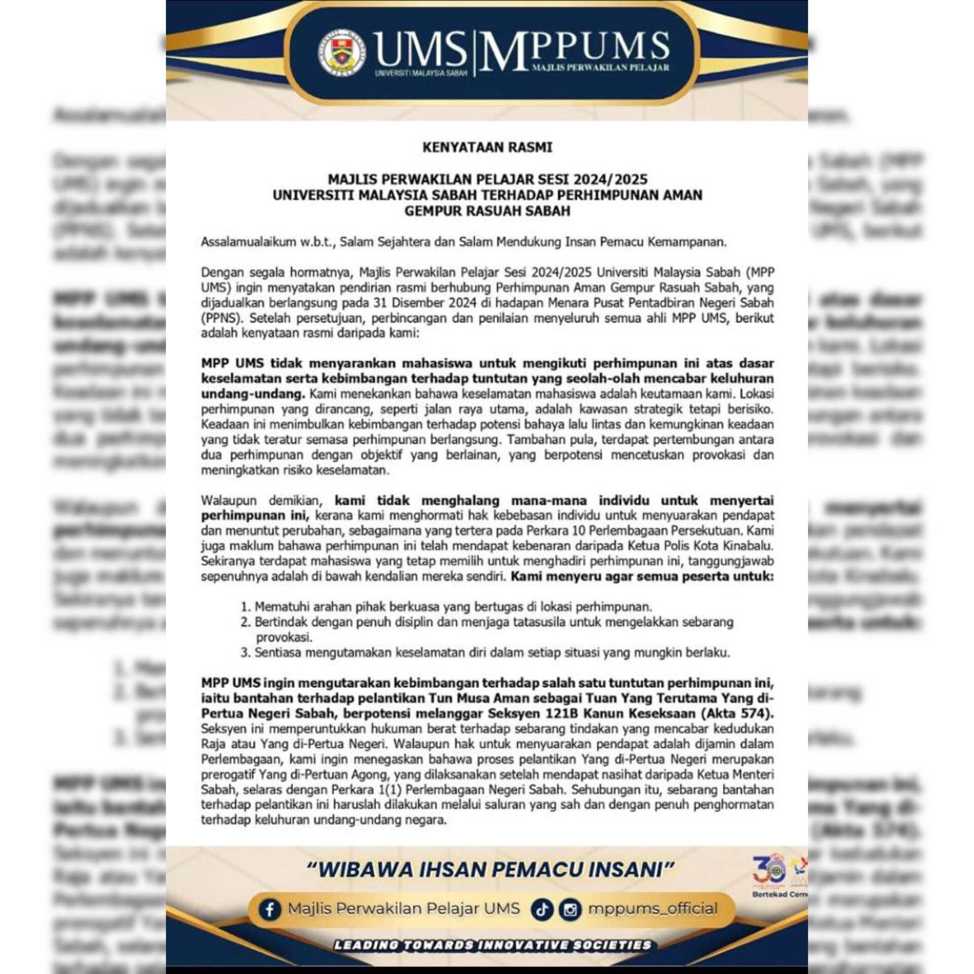 KOTA KINABALU: Majlis Perwakilan Pelajar (MPP) Universiti Malaysia Sabah (UMS) Sesi 2024/2025 telah mengeluarkan kenyataan rasmi hari in berhubung pendirian mereka terhadap Perhimpunan Aman Gempur Rasuah Sabah yang dijadualkan berlangsung pada 31 Disember 2024 di hadapan Menara Pusat Pentadbiran Negeri Sabah (PPNS).