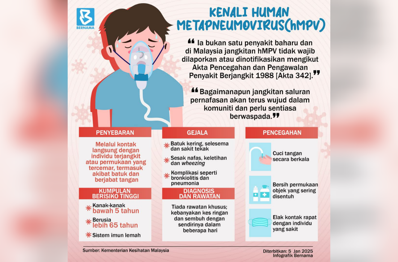 “Tidak seperti SARS-CoV-2 (yang menyebabkan COVID-19) pada 2020, hMPV tidak menular seluas itu tanpa gejala dan keseriusannya secara umum boleh diuruskan dalam populasi yang sihat,” katanya kepada BERNAMA dalam temu bual eksklusif baru-baru ini.