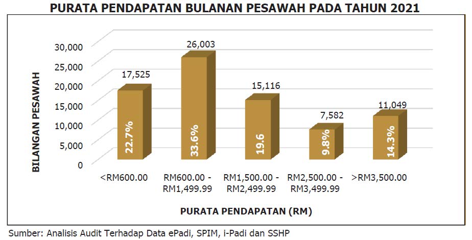 - Lebih 55% petani padi memperoleh pendapatan bulanan di bawah RM1,500, iaitu di bawah kadar Gaji Minimum.