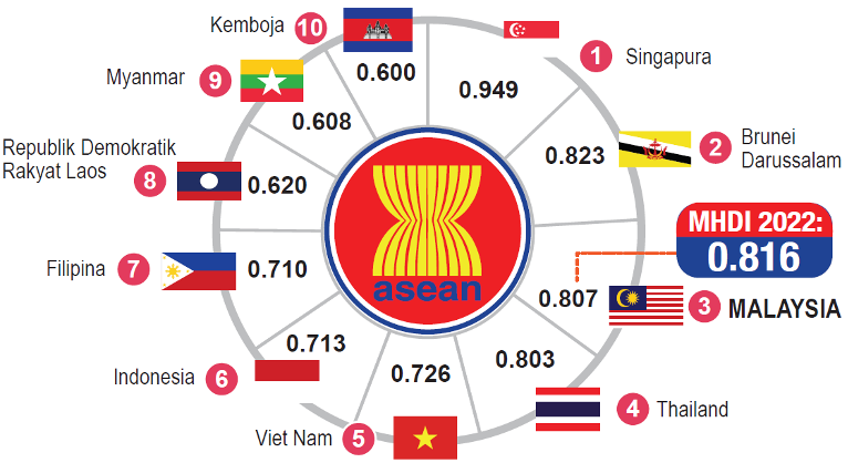 Dalam ASEAN, Malaysia berada di tangga ke-3 selepas Singapura (0.949) dan Brunei Darussalam (0.823). Malaysia juga kekal di atas purata HDI dunia sepanjang tahun 2015 hingga 2022.