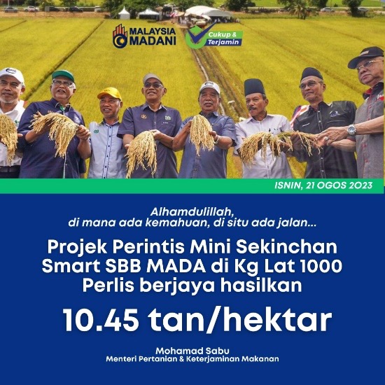 Menurut Menteri Pertanian, inisiatif ini dijangka dapat meningkatkan purata hasil padi kepada 5.6 tan per hektar serta melonjakkan pendapatan petani sebanyak 50%, iaitu dari RM31,000 kepada RM46,000 setahun.