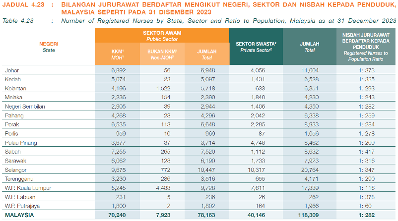 Menurut laporan Petunjuk Kesihatan 2024, Malaysia mempunyai 118,309 jururawat berdaftar, dengan 66% berkhidmat di sektor awam dan selebihnya di sektor swasta. Walau bagaimanapun, nisbah jururawat kepada penduduk semakin merosot, daripada 1:279 pada 2022 kepada 1:282 pada 2024. Beberapa negeri seperti Sabah mencatat nisbah lebih tinggi, iaitu 1:417, berbanding 1:368 pada tahun sebelumnya.