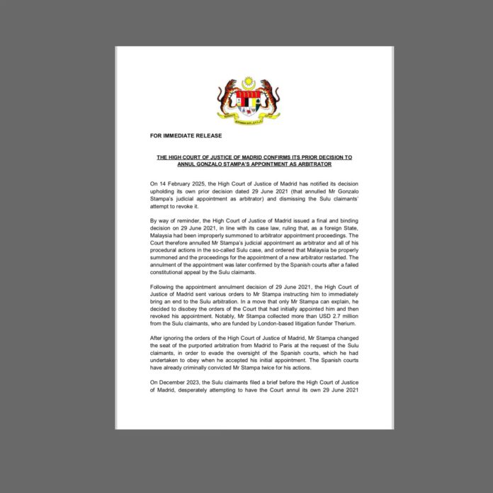 Kuala Lumpur — Kerajaan Malaysia menyambut baik keputusan Mahkamah Keadilan Tinggi Madrid dan menegaskan bahawa langkah-langkah yang diambil oleh mahkamah Sepanyol membuktikan kesahihan tindakan negara dalam mempertahankan kedaulatan dan kepentingannya berhubung kes Gonzalo Stampa sebagai penimbang tara dalam kes tuntutan pihak yang mendakwa sebagai waris Kesultanan Sulu terhadap Malaysia.