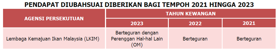 LKAN 1/2025 menggambarkan Lembaga Kemajuan Ikan Malaysia (LKIM) seumpama ‘problem child’ kerana sudah di berikan Pendapat Diubahsuai bagi 3 tahun berturut-turut (2021 – 2023). Malah, LKIM merupakan satu-satunya agensi yang menerima Pendapat Diubahsuai berulang kali berturut-turut.