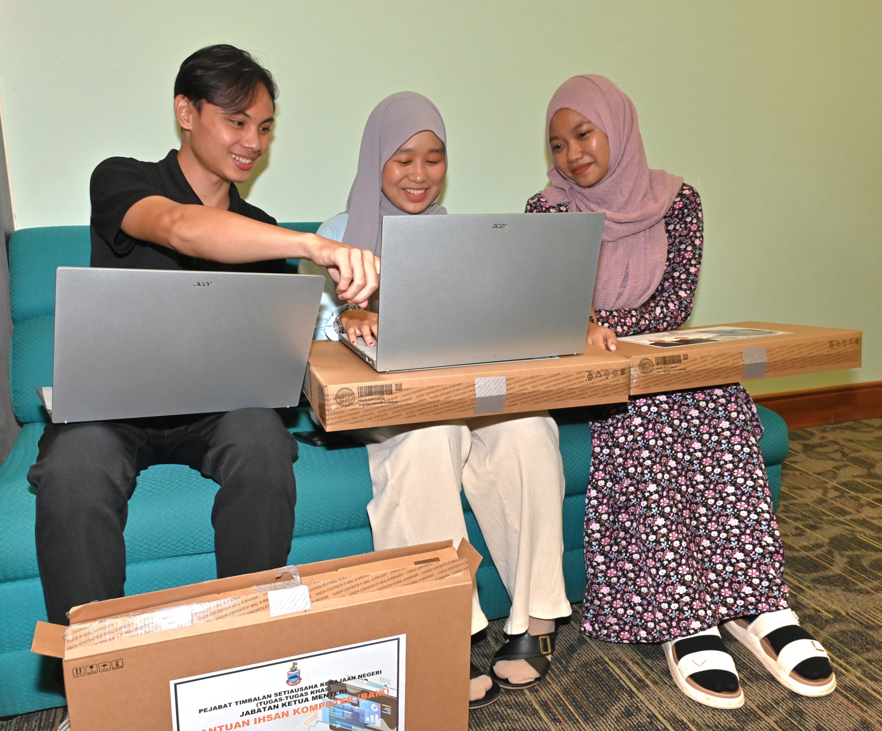 Penerima Bantuan Ihsan Komputer (BAIK), Trenngo Masingkin (kiri), Rosammizah Jamri (tengah) dan Sulpika Aini (kanan) gembira melihat komputer riba baharu yang diberikan oleh kerajaan negeri.
