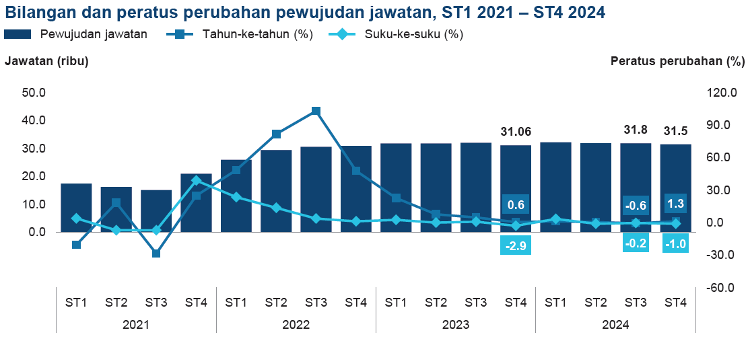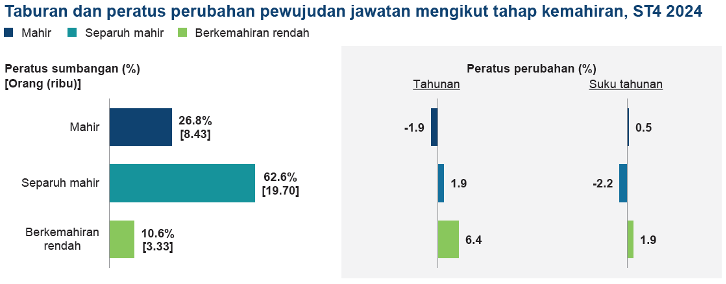 Namun begitu, analisis menunjukkan majoriti pekerjaan yang diwujudkan adalah dalam kategori separuh mahir dan kemahiran rendah. Laporan Jabatan Perangkaan Malaysia (DOSM) bagi suku keempat 2024 merekodkan hanya 25% daripada keseluruhan jawatan di pasaran kerja tergolong dalam kategori mahir. Malah, kadar guna tenaga tidak penuh berkaitan kemahiran mencecah 36%, melibatkan 1.93 juta pekerja yang memiliki pendidikan tertiari tetapi hanya mendapat pekerjaan separuh mahir atau kemahiran rendah.