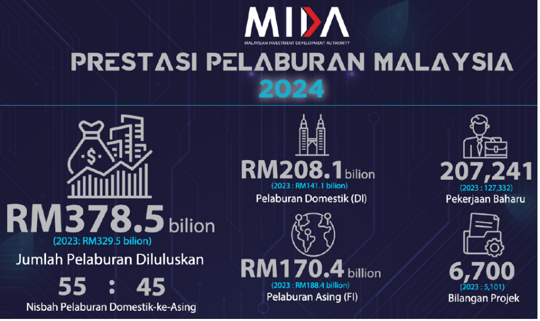 Menurut data yang dikeluarkan oleh Malaysian Investment Development Authority (MIDA), Malaysia merekodkan jumlah pelaburan tertinggi dalam sejarah pada 2024, berjumlah RM378.5 bilion – peningkatan hampir 15% berbanding 2023. Pelaburan ini dijangka mencipta 207,241 pekerjaan baharu, meningkat 65% daripada tahun sebelumnya.