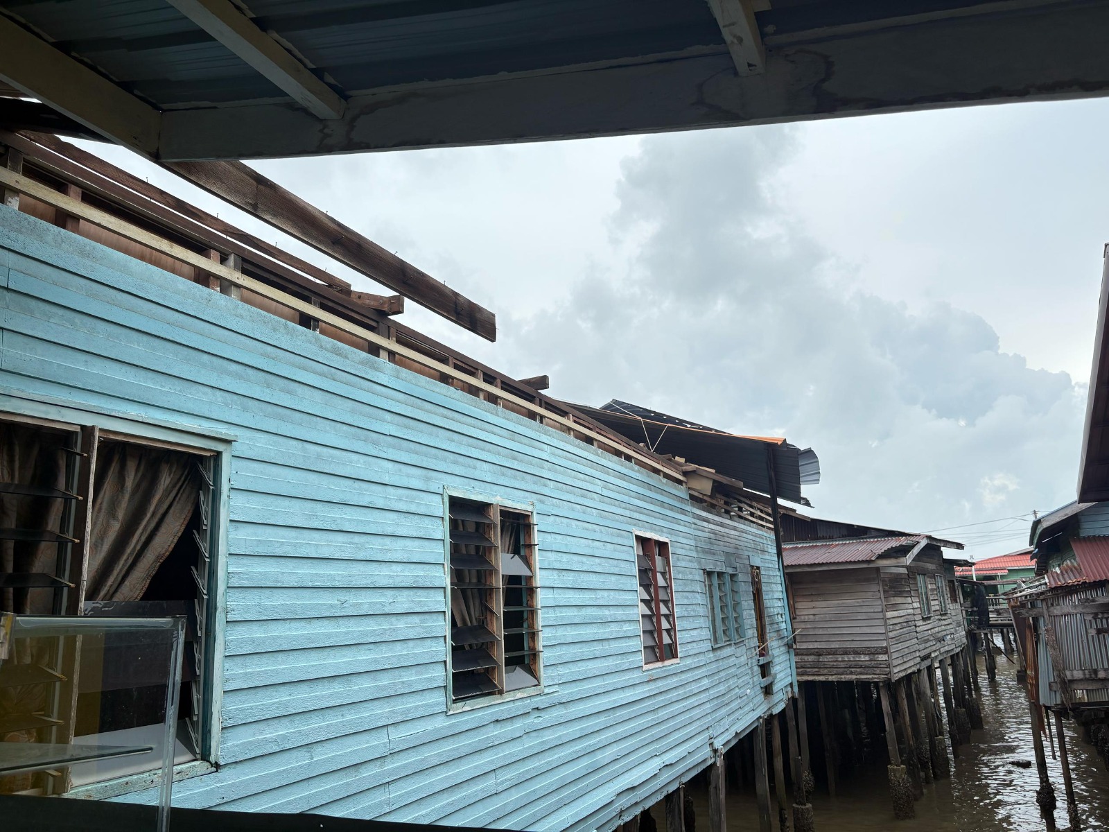 Rumah-rumah tersebut, yang terletak di atas air, terkesan teruk akibat angin kencang yang disertai hujan lebat.