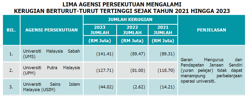Selain itu, tiga universiti – UMS, UPM, dan Universiti Sains Islam Malaysia (USIM) – disenaraikan antara lima agensi persekutuan dengan kerugian tertinggi sepanjang tempoh 2021–2023, dengan jumlah kerugian terkumpul mencecah RM708.45 juta.