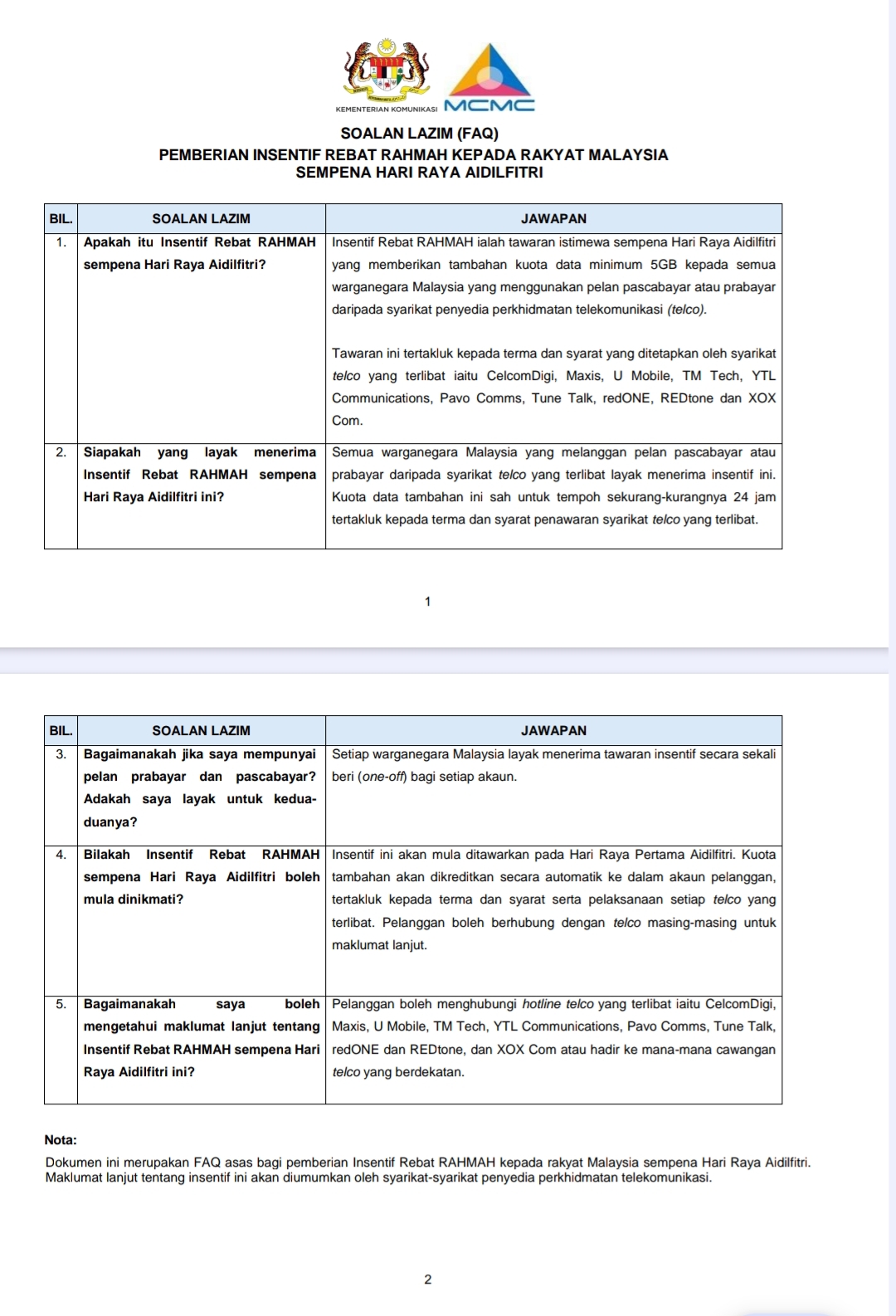Putrajaya : Insentif rebat Rahmah berbentuk tambahan kuota data minimum 5GB diberikan kepada semua pengguna perkhidmatan telekomunikasi warganegara Malaysia (prabayar dan pascabayar) pada Hari Raya Aidilfitri pertama.