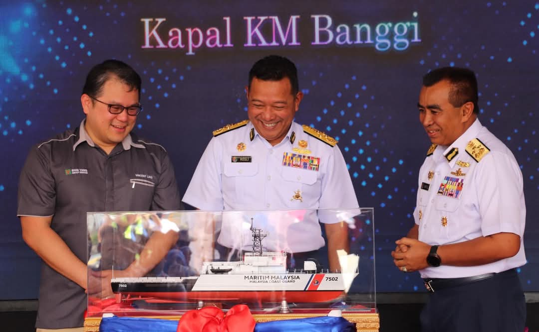 Hadir sama Timbalan Ketua Pengarah (Logistik) Maritim Malaysia, Laksamana Madya Maritim Datuk Saiful Lizan Ibrahim dan Pengarah Eksekutif Shin Yang Shipyard, Mr Vincent Ling Lu Yew. – SABAH MEDIA / FOTO MARITIM MALAYSIA