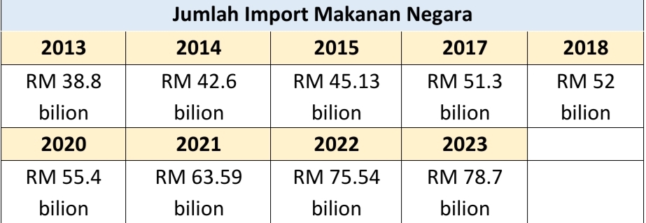 9. Matlamat utama Kerajaan Malaysia ialah untuk meningkatkan produktiviti sektor pertanian negara bagi mengurangkan kebergantungan tinggi kepada import. Data Kementerian Pertanian dan Keterjaminan Makanan Malaysia menunjukkan jumlah import makanan negara telah meningkat begitu tinggi 103% dalam tempoh masa 11 tahun (2013 – 2023):