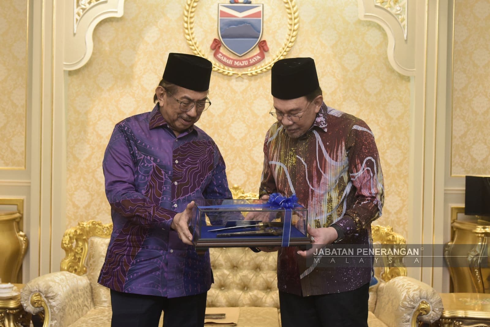 Kota Kinabalu : Perdana Menteri Datuk Seri Anwar Ibrahim pagi tadi mengadakan kunjungan hormat ke atas Yang di-Pertua Negeri Sabah Tun Musa Aman di Istana Seri Kinabalu.