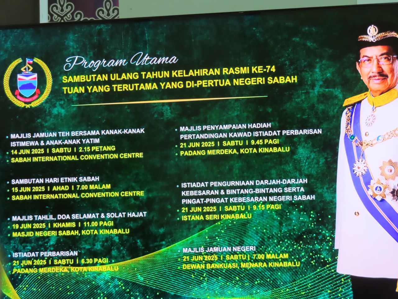 “Sambutan ini bukan sekadar istiadat tahunan, tetapi satu lambang kasih sayang rakyat terhadap pemimpin tertinggi negeri serta semangat cintakan Sabah,” katanya dalam sidang media khas yang turut dihadiri Setiausaha Tetap Kementerian, Datuk Dr. Jamili Nais; Setiausaha Sulit TYT, Izharudin Jalaludin; Pengarah Penyiaran Sabah, Mohd Yusni Mohamed Ali; dan Pengarah Penerangan Sabah, Jainisah Mohd Noor.