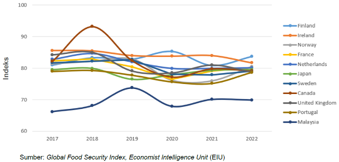Namun, indikator semasa tidak memihak kepada Malaysia. Laporan DOSM mendedahkan bahawa tahap keterjaminan makanan kekal rendah walaupun terdapat sedikit peningkatan skor indeks — dari 68.1 (2018) kepada 69.9 (2022). Lebih membimbangkan, kedudukan Malaysia dalam Indeks Keterjaminan Makanan Global terus merosot: dari tangga ke-28 (2019) kepada ke-41 (2022), daripada 113 negara.